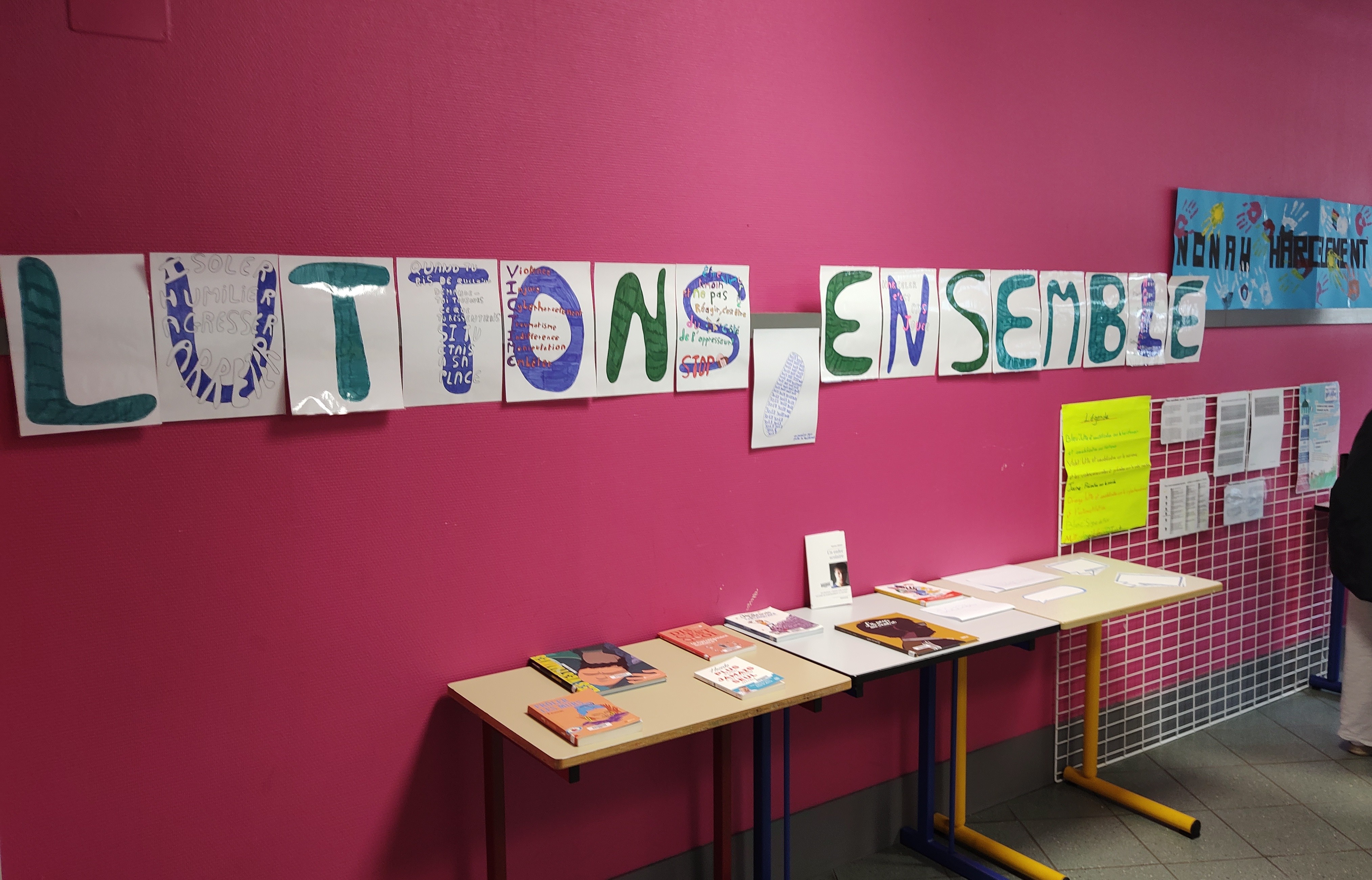 L'équipe des AED pilotée par Imène et Marianne organise une journée de lutte contre le harcèlement : expositions, ateliers, création d'une fresque, intervention d'une association sur le thème du cyberharcèlement (ADEP)